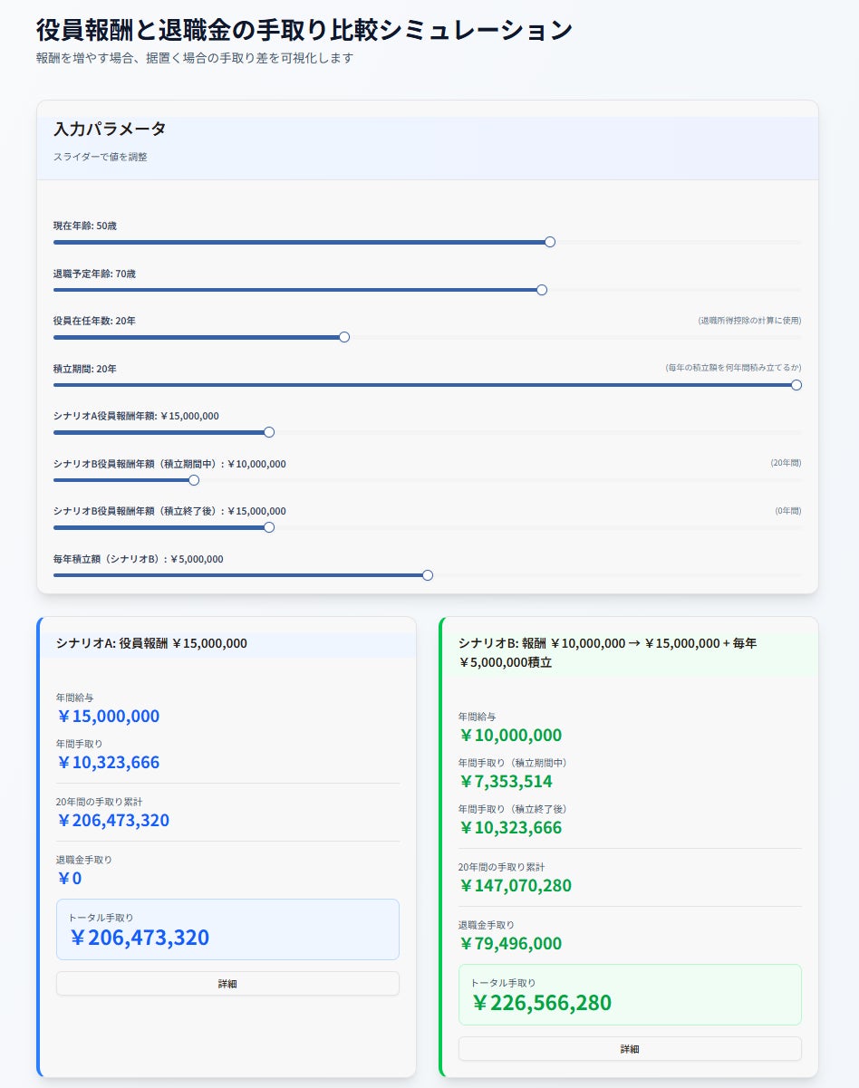役員報酬と退職金の手取り額を即座に比較することで、最適な投資戦略を見つけ出します。