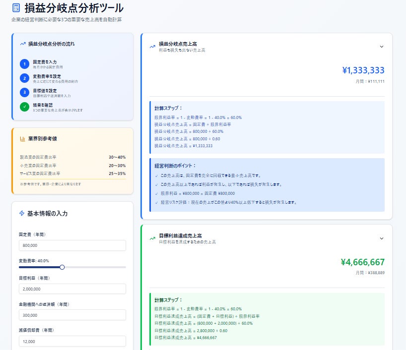 経営判断に欠かせない売上水準を自動計算します。固定費・変動費率・目標利益・借入返済額などを入力するだけで必要売上高を可視化。